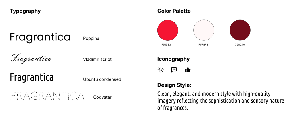 Color Palette: The red captures attention and conveys passion, ideal for highlighting calls to action and special features. The light pink offers a gentle contrast, softening the overall look and making the user interface feel inviting. The deep maroon injects a sense of luxury and depth, resonating with the premium nature of fragrances.