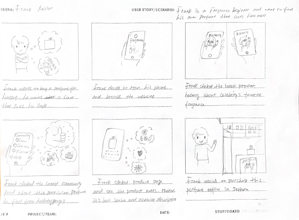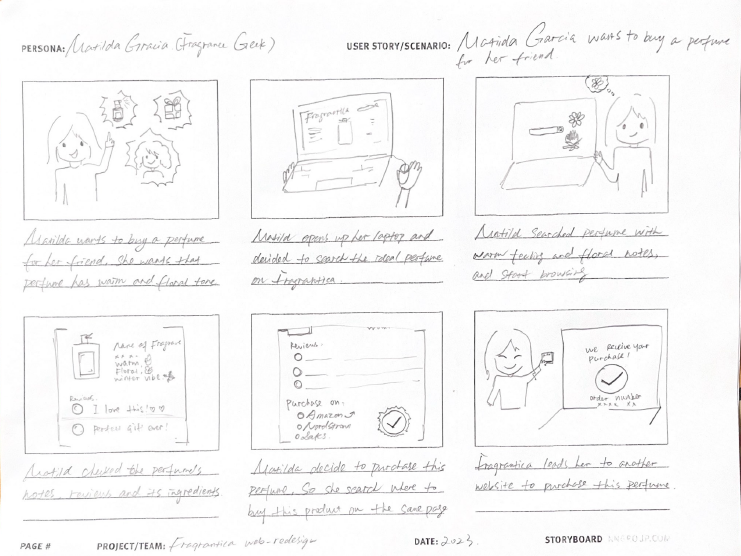 In the Fragrantica redesign, storyboarding user pathways reveals key insights: Matilda, the Content Creator, searches for perfumes by scent layers, while Frank, the Viewer, seeks the latest news and trending hashtags. Accordingly, we’ve placed notes alongside news and hashtags on our homepage to meet the primary needs of our main user groups.