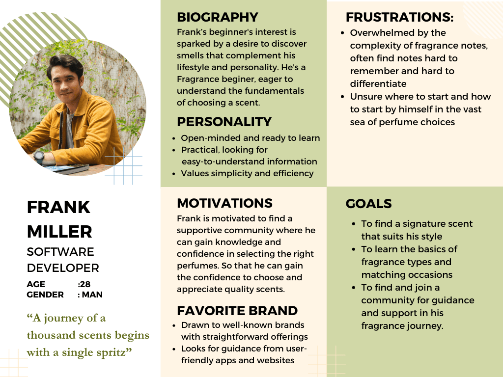 Matilda, an experienced enthusiast, seeks to deepen her knowledge of niche perfumes and engage with like-minded individuals, while Frank, aims to learn the basics and find a signature scent with ease and support.