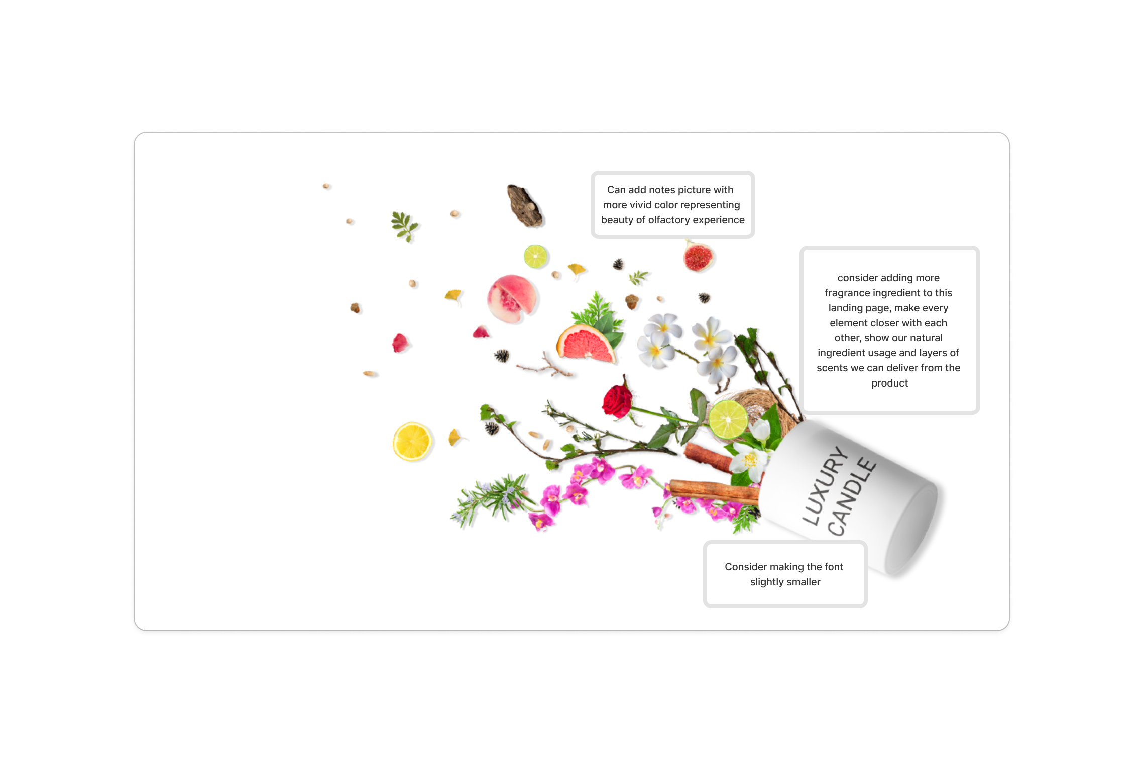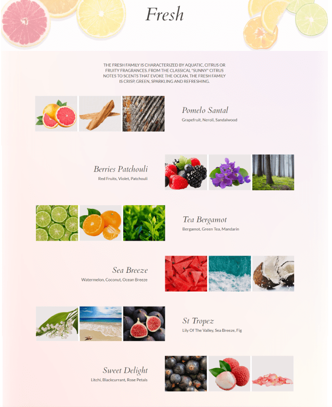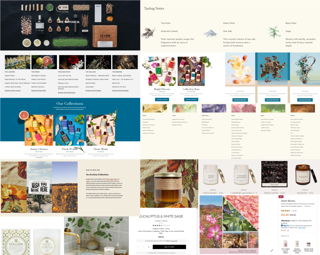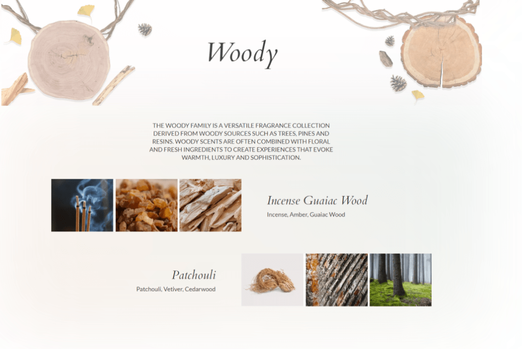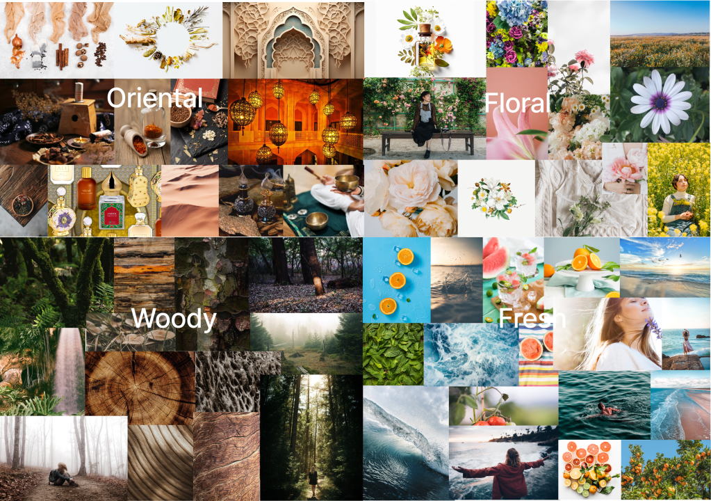 This mood board I created is an essential tool to visually communicate the aesthetic and emotional tone of this project. It serves as a visual reference that aligns the team and stakeholders on the project’s creative direction. It presents a cohesive visual narrative that aligns with the sophistication and sensory richness of the fragrances. The images chosen for each scent category provide a diverse but harmonious blend that speaks to the olfactory experiences each represents. Oriental represent exoticism and richness, Floral suggest softness and romance, Wood give a sense of groundedness and nature, while Fresh captures lightness and vibrancy.
