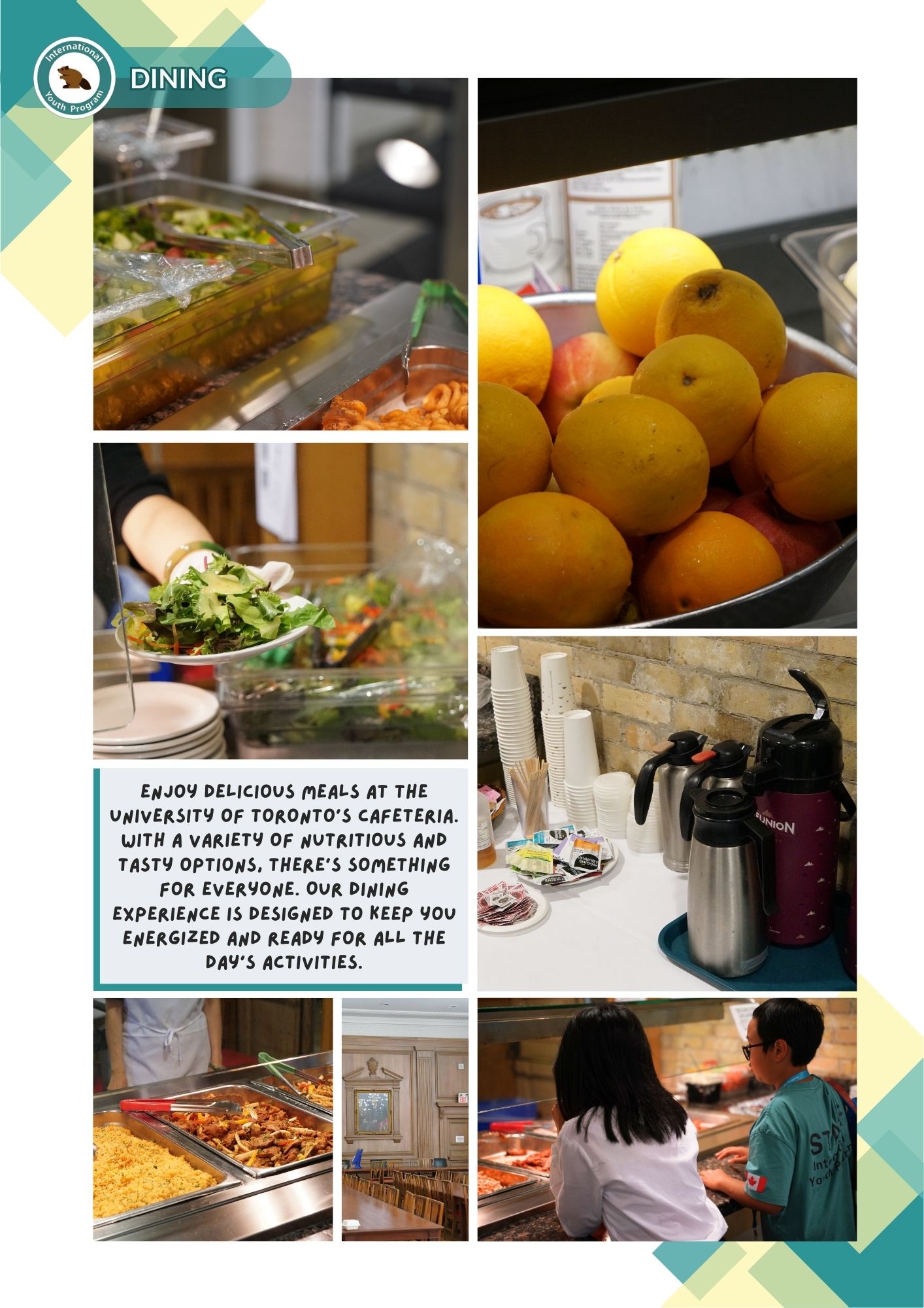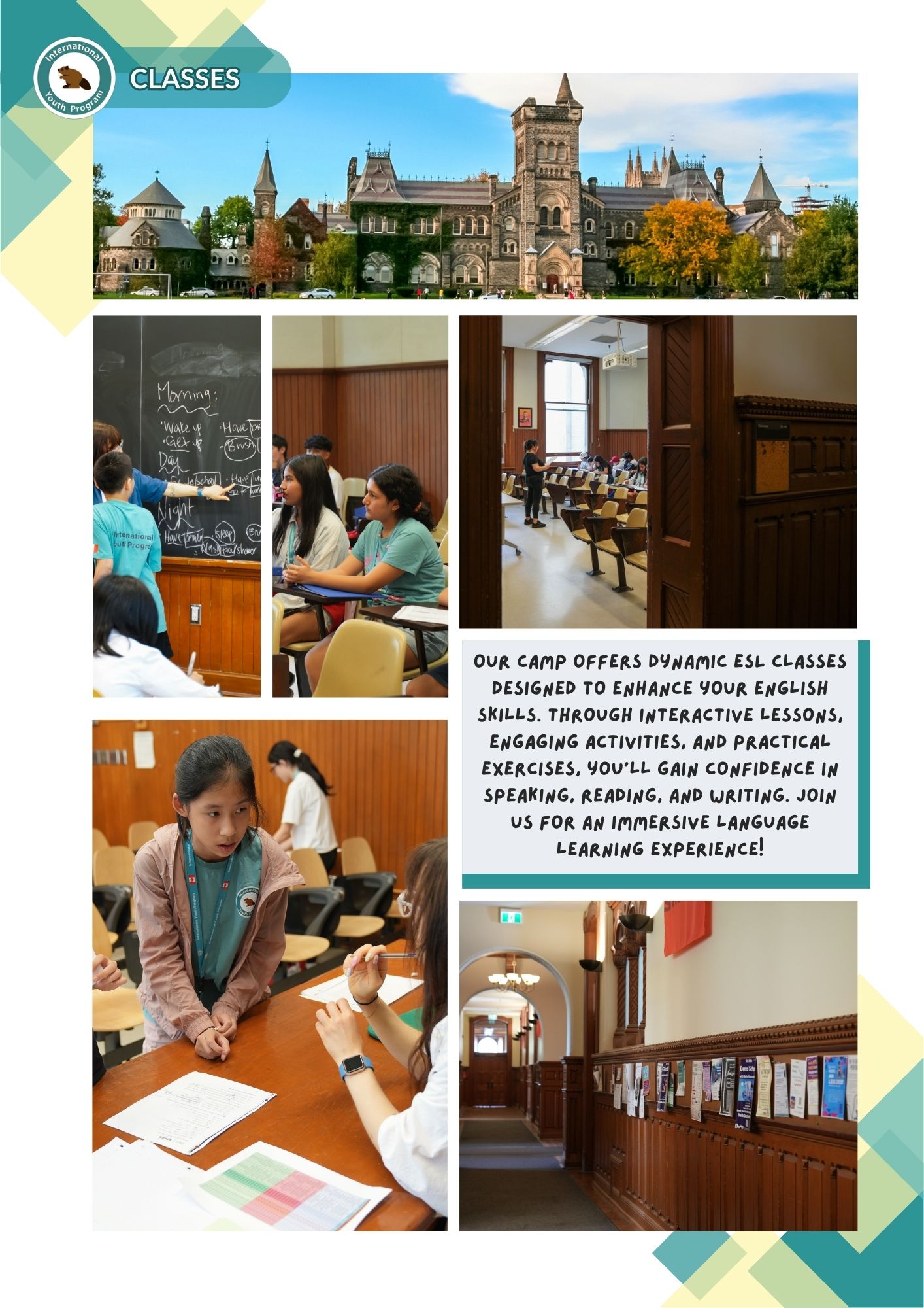 Summer Camp Introduction: This section gives details about the camp’s facilities, including the accommodations, dining hall, classrooms, and activities. Each aspect is highlighted with images and short descriptions.