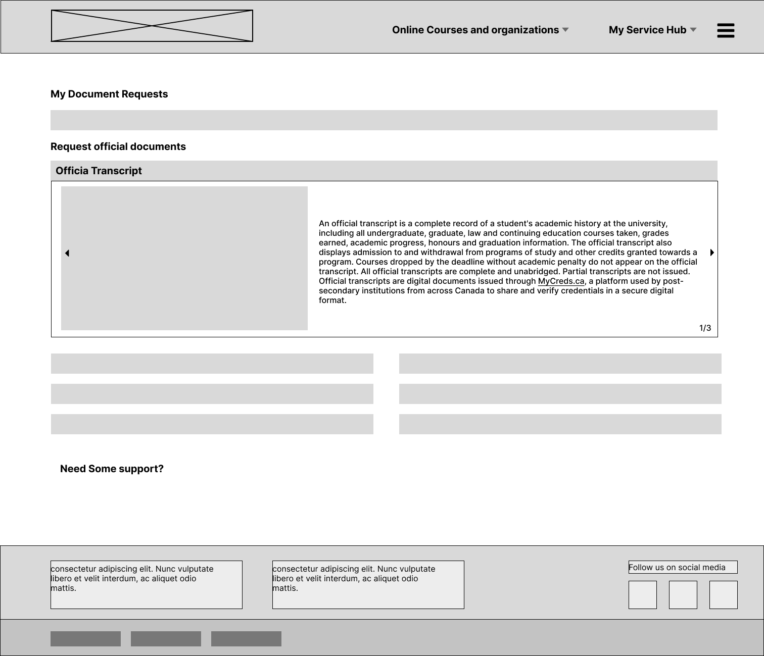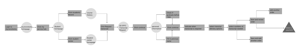 I assume that past or current students from Toronto MU are having a hard time find the right place to request any documents from school, therefore, I hypothesise that if I reduce the amount of steps user need to take to request any documents from school and re-organize information with clearer information architecture, student will spend less time find what they need.