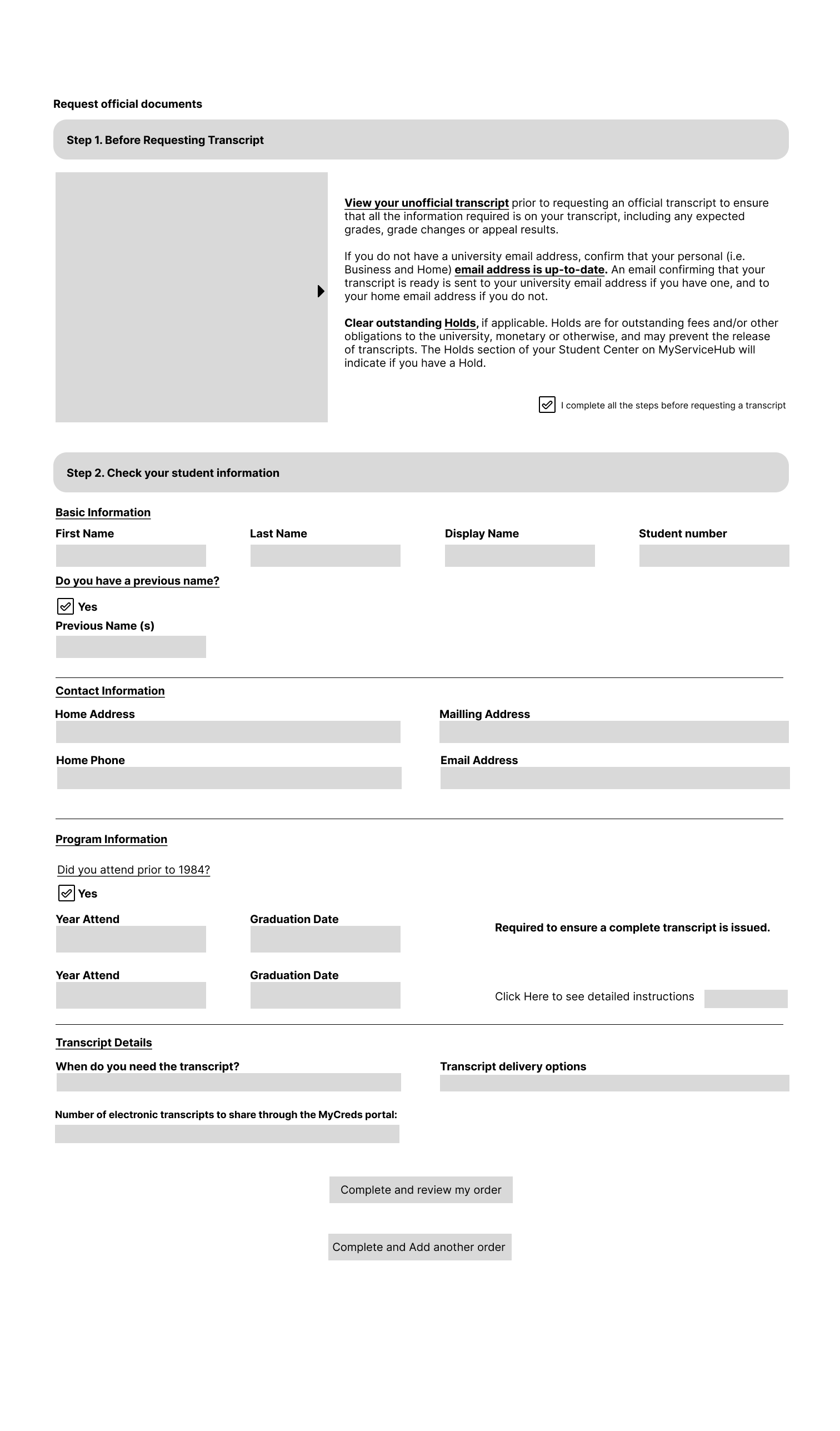 This project redesigned Toronto Metropolitan University’s document request task, streamlined the submission process, reducing the steps required and integrating clear, step-by-step guidance. The redesign also introduced real-time status tracking, significantly improving the transparency and efficiency of the document request experience for students.
